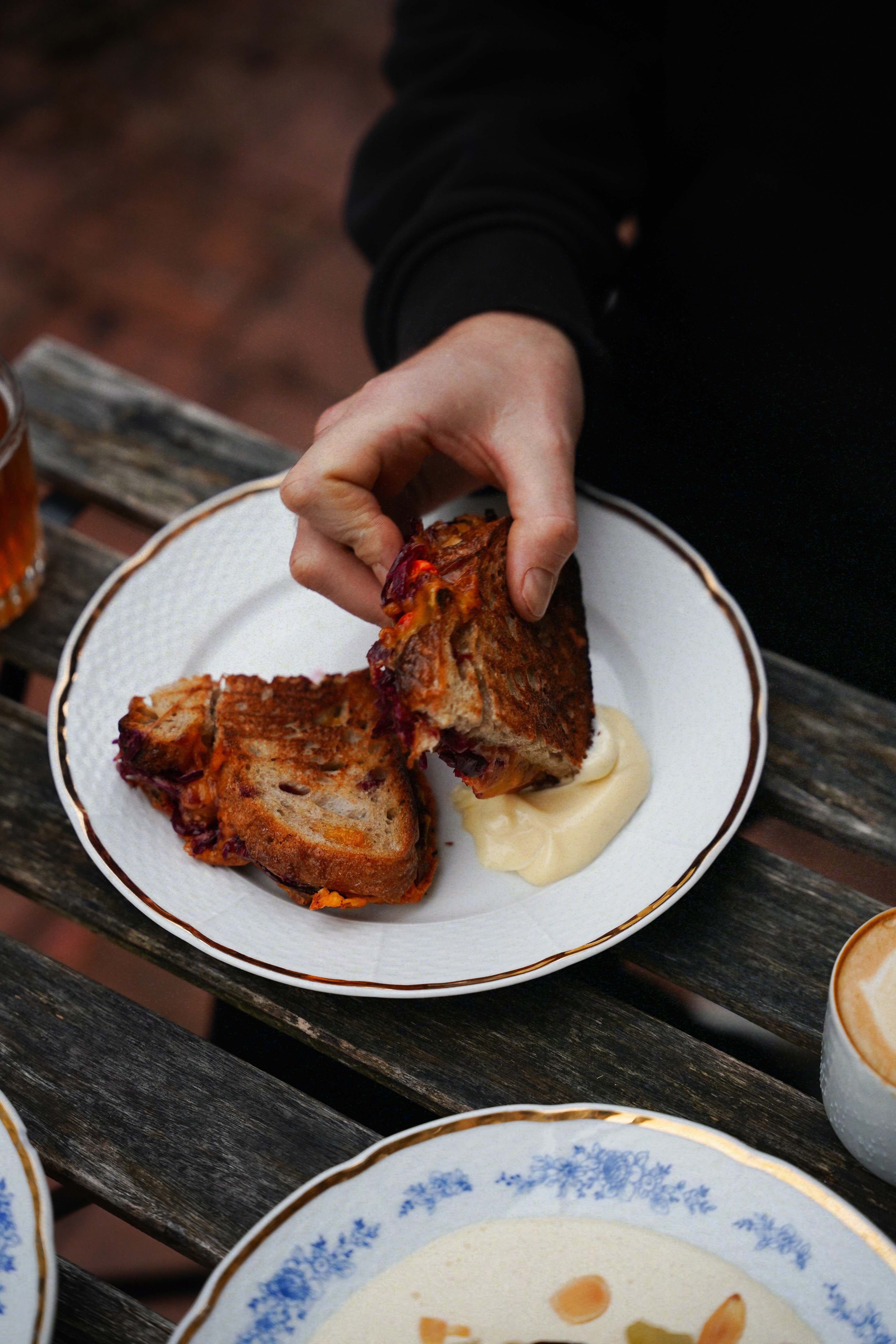 (aka Grilled Cheese Sandwich) For the winter season, prepared with cheddar cheese and fermented red cabbage with sea buckthorn, adding a distinctive sweet-and-sour note. Served with homemade smoked mayonnaise. Our mayonnaise is made from egg yolks, mustard, wine vinegar, salt, and rapeseed oil, lightly sweetened with maple syrup and gently smoked. Options: without cabbage & sea buckthorn, or without mayonnaise