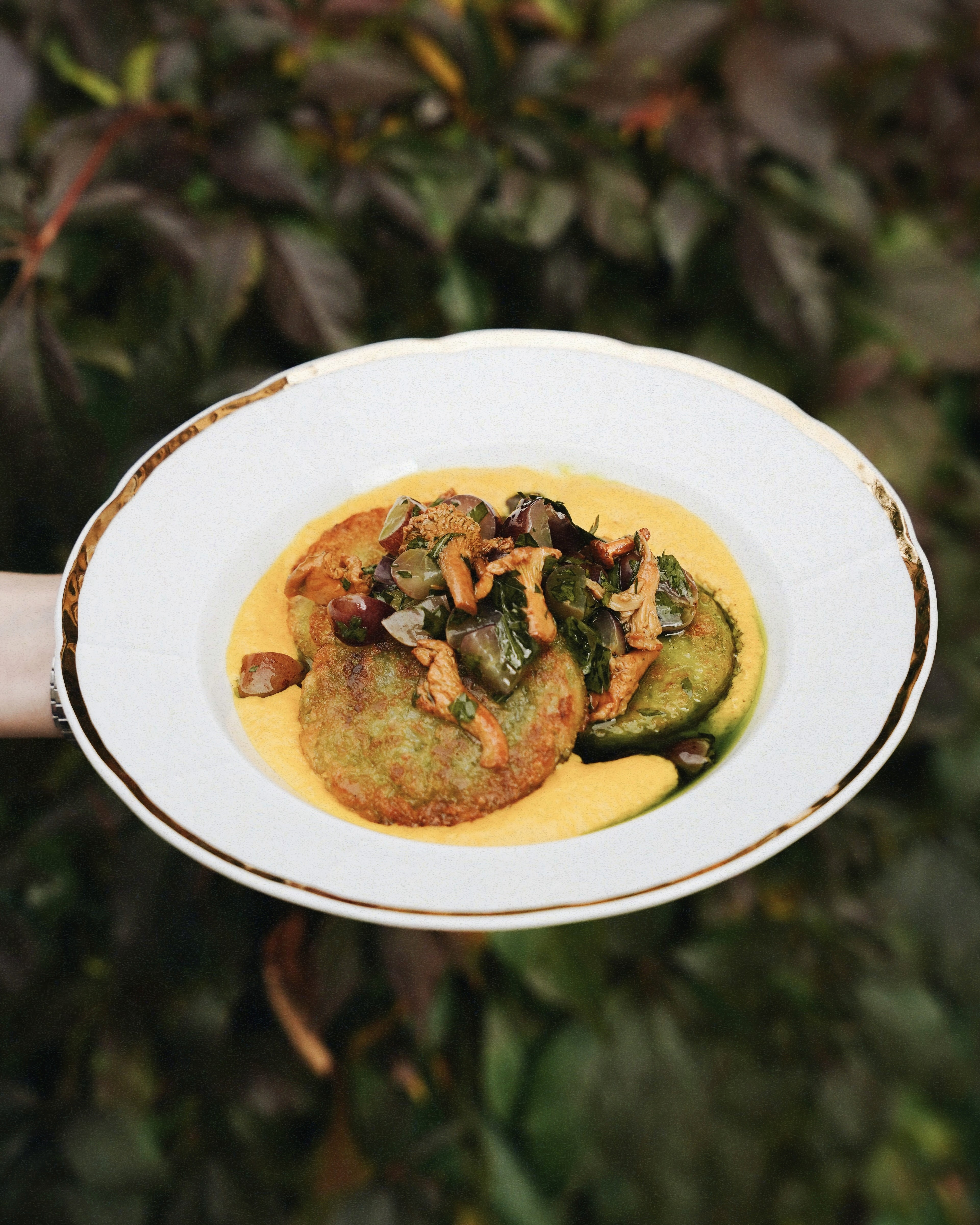A rich and satisfying brunch favorite. Three hash browns served with a fluffy foam made from roasted carrots, offering a deep, umami flavor reminiscent of a cheese sauce. Earthy notes are balanced by a salad of sweet-and-sour grapes, flat-leaf parsley, and pickled chanterelles. Vegan and gluten-free dish