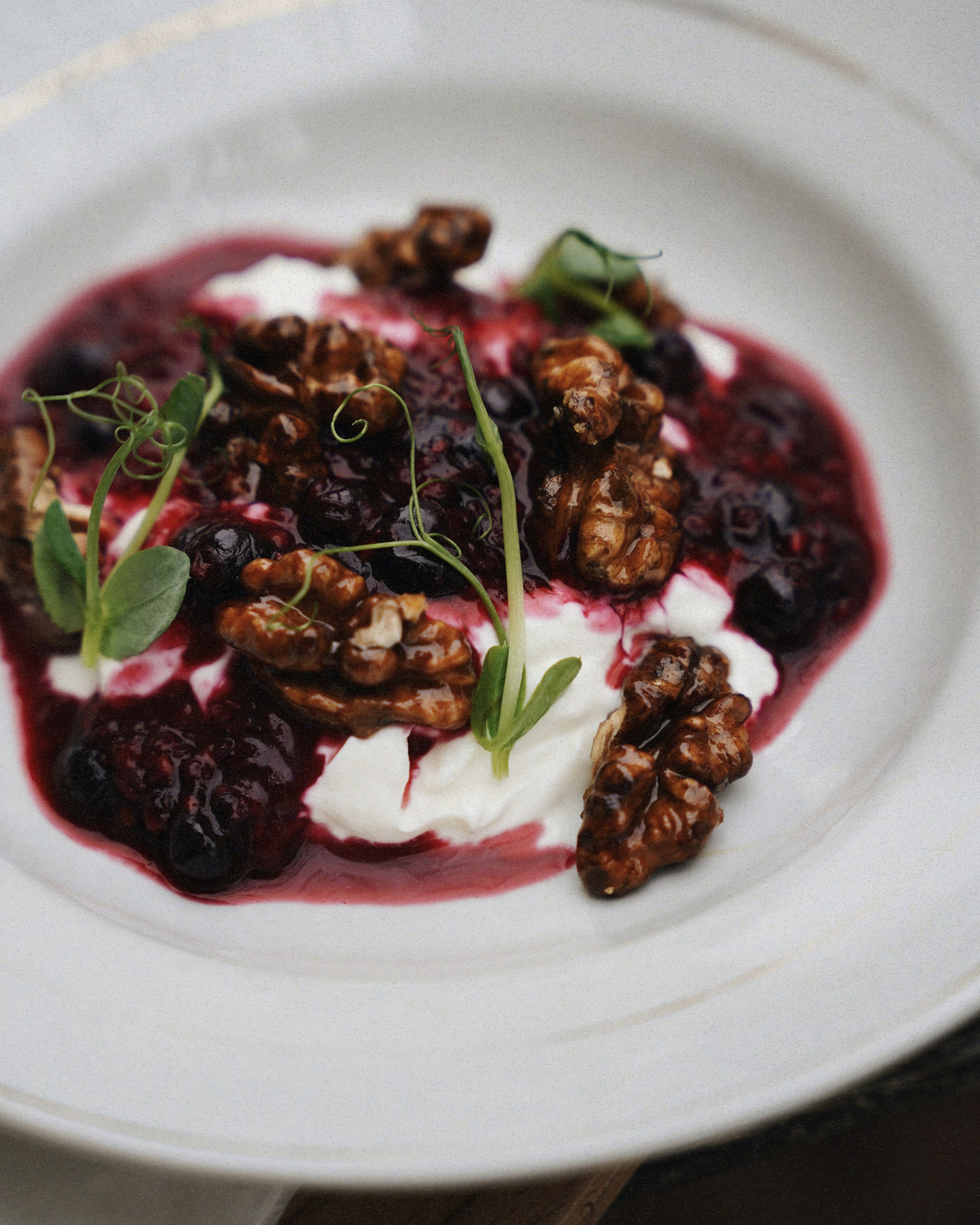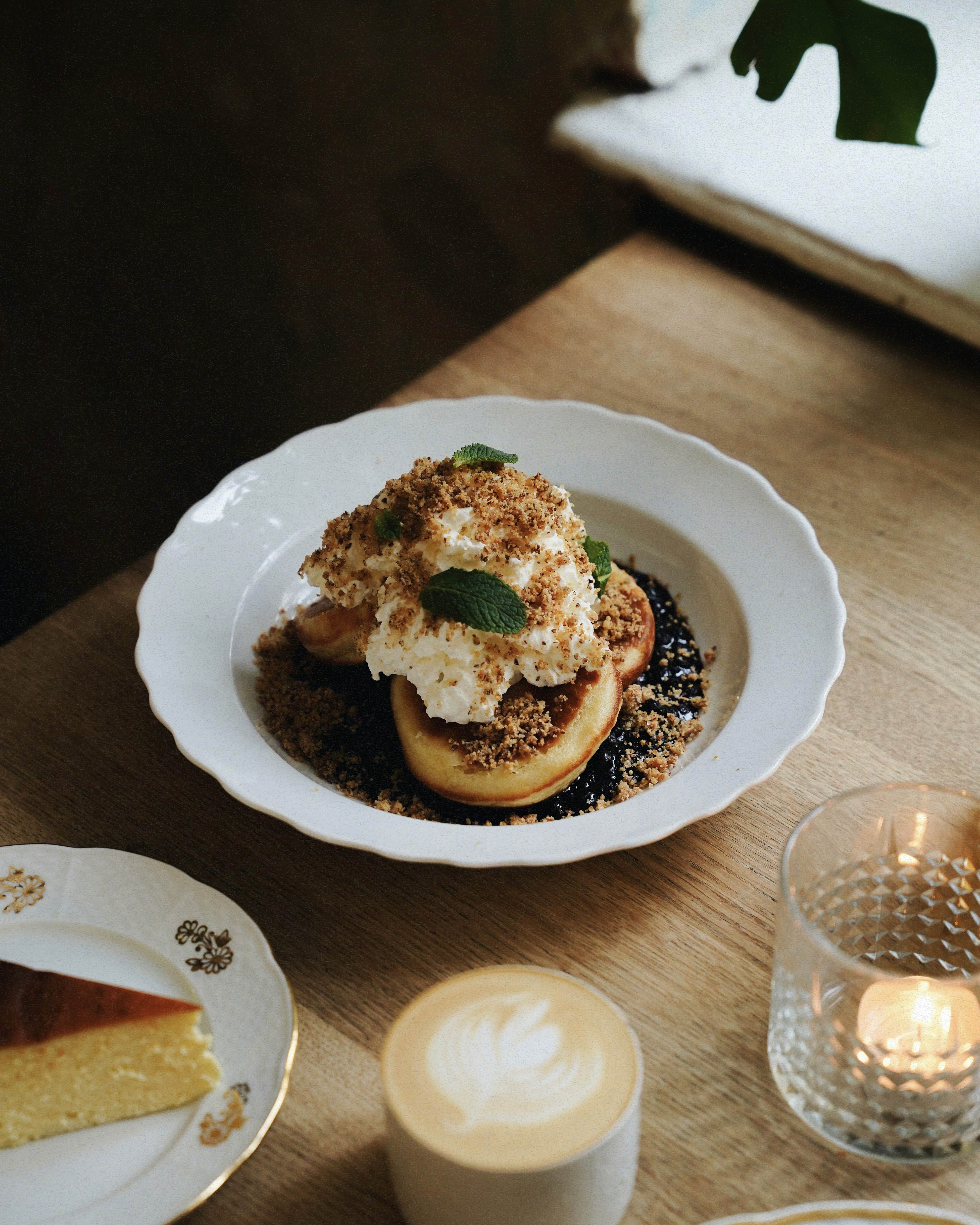 The return of our classic yeasted pancakes. This time served with a sweet blueberry compote spiced with star anise, cinnamon, and cardamom. Light lemon whipped cream adds freshness, while a bold almond crumble provides a pleasant crunch. Finished with fresh mint leaves.