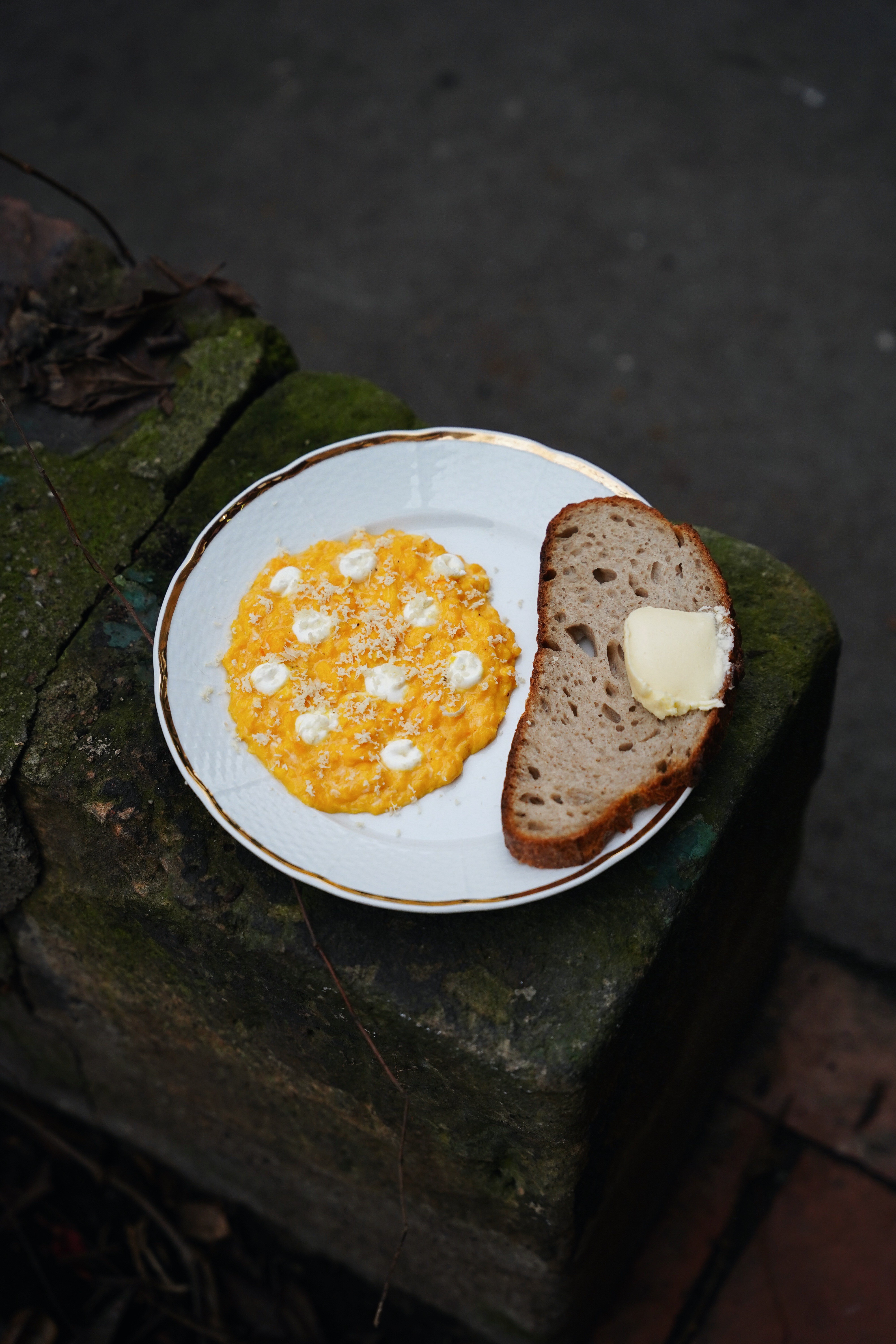 4 scrambled eggs in butter, fresh creamy cheese seasoned with salt and pepper, freshly grated horseradish, slice of bread, farmhouse butter. A soft and creamy take on scrambled eggs, finished with a subtle kick from fresh horseradish. Options: gluten-free bread available. extra eggs, extra ham, extra fermented cabbage & sea buckthorn salad