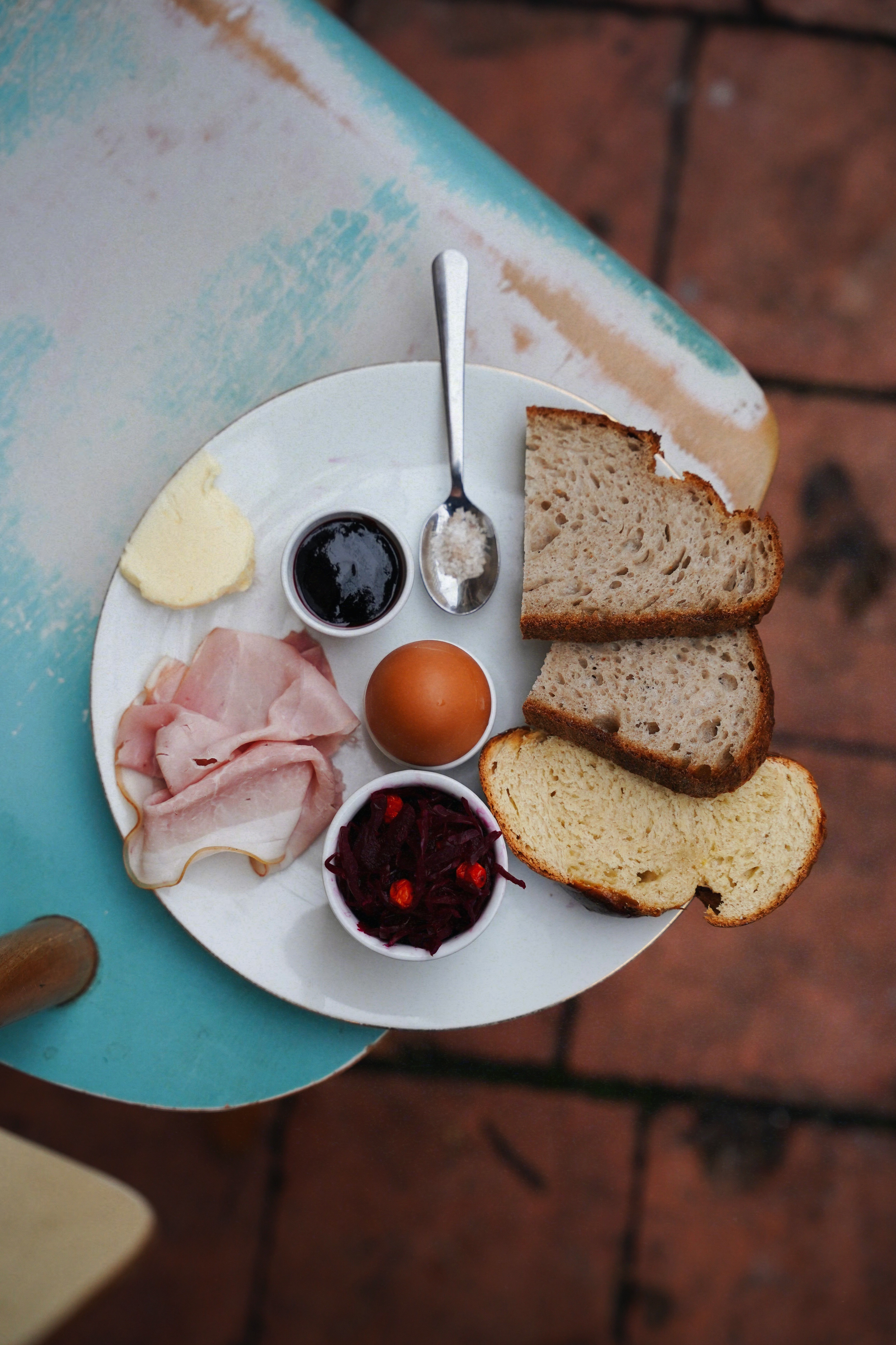 1 soft-boiled egg (5 minutes), slice of sourdough bread, bone-in ham from Pršutérie, fermented red cabbage with sea buckthorn, farmhouse butter, redcurrant jam, Maldon black salt. A simple Copenhagen-style breakfast with a Czech twist. A balanced plate combining savory flavors, egg, bread, ham, fermented cabbage with a sweet note from homemade redcurrant jam. Served with one soft-boiled egg in an egg cup, farmhouse butter, sourdough bread, and our house-made redcurrant jam. Options: gluten-free bread available, extra egg, ham, bread, etc